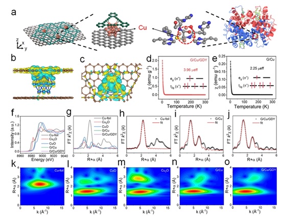 该团队创新性地提出利用石墨炔辅助构建三维结构纳米酶的通用仿生策略,面向环境保护与治理、智能制造等国家战略需求,实现了纳米酶的高效催化性能提升,并展现了其在生态环境治理和新材料开发中的广阔前景。在国家自然科学基金的支持下,他们利用在铜纳米颗粒(Cu NPs)表面原位生长石墨炔(graphdiyne, GDY)的方法,与石墨烯(graphene, G)共同形成夹层,制备了具有三维结构的类漆酶纳米酶(G/Cu/GDY)。在该研究中,他们将新型的二维周期性材料GDY用来模拟天然酶的辅因子,实现了天然酶三维几何结构的仿生构建,超越了传统三维纳米酶分子配体的限制。同时GDY支架内多个sp键与金属纳米粒子之间的d-π相互作用简化了纳米酶构建LEF时对活性中心和合成的要求,并进一步模拟了更大范围的局部不对称电场,加速底物与纳米酶之间的电子转移,表现出更高的类漆酶活性(超越天然漆酶4.72倍),在环境污染检测与降解中的表现出巨大的实际应用潜力。更重要的是,这种在纳米酶中以生物模拟方式构建三维几何和电子结构的简单方法,为纳米酶的仿生设计提供了一个通用的框架,为纳米酶研究领域向着更高效、更通用和更环保的方向发展做出了卓越的贡献。