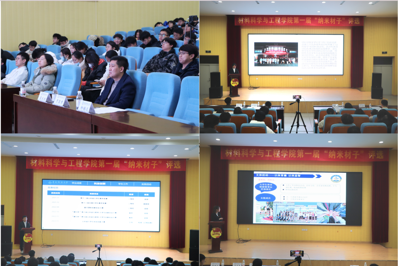 本次评选活动通过个人申报、资格审查、学院推优等环节推选24名同学参加评选答辩。“纳米材子”共设置科技创新、文体活动、志愿服务、员工骨干、拼搏励志、班级建设、宿舍建设7个类别,旨在全面展示员工在各方面的优秀表现和卓越成就。参选人员通过PPT、视频等多种答辩形式向评委和现场观众全面展现优秀材料学子的良好精神风貌。